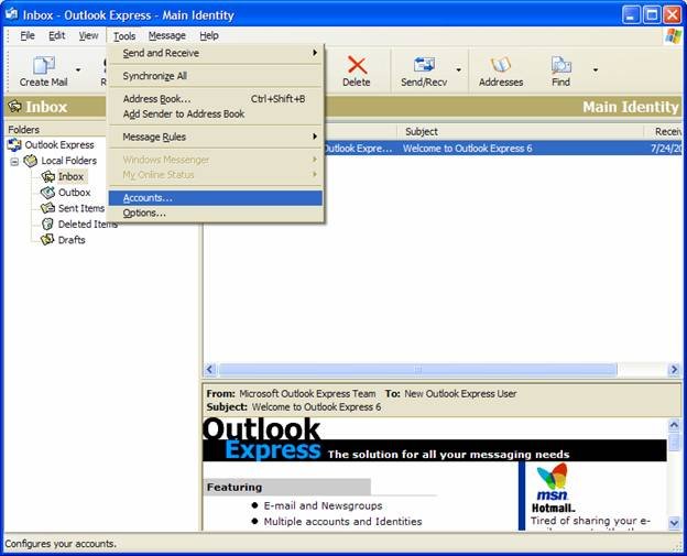 As shown above, use the Tools and Accounts menu selection to add your new e-mail address.
