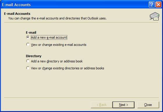 Select to “Add a new e-mail account” and choose Next.